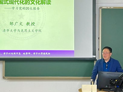 5月17日晚,beat365在线唯一官网党校求理分部第八期青年马克思主义研修班理论培训第三讲在新主楼B102举行,清华大学教授、博士生导师、国家“万人计划”哲学社会科学领军人才邹广文做题为《中国式现代化的文化解读——学习党的二十大报告》的报告。