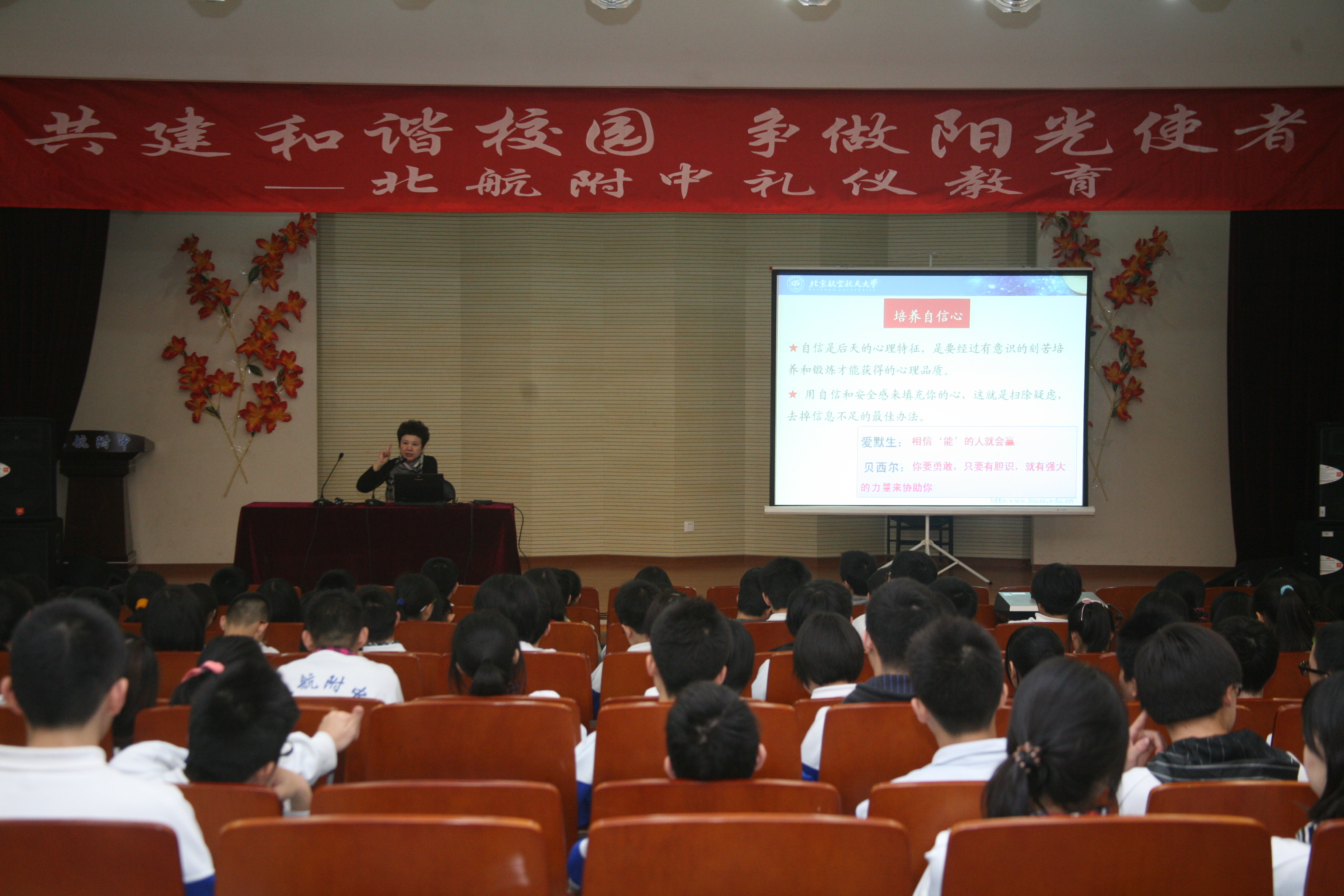 3月14日,在北航附中文明礼仪教育活动月之际,beat365姚小玲教授应邀来到附中,为同学们带来了一堂题为“演讲与口才”的礼仪教育课程。
