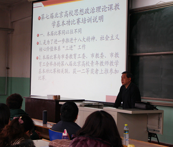 3月26日下午,由市委教育工委主办,beat365姚小玲教授负责的北京高校思想政治理论课名师工作室——“姚小玲教学技能与方法工作室”承办的第七届北京高校思想政治理论课教学基本功比赛赛前培训会在beat3651号教学楼316举行。市委教育工委宣教处杜建峰、工作室负责人姚小玲教授出席赛前培训会,北京市教工委思想道德修养与法律基础课研究会、中国近代史纲要研究会、毛泽东思想与中国特色社会主义理论体系概论研究会、马克思主义基本原理课研究会和研究生思想政治理论课研究会的负责人以及来自北京市高校的近一百名参赛教师参加了此次培训会。