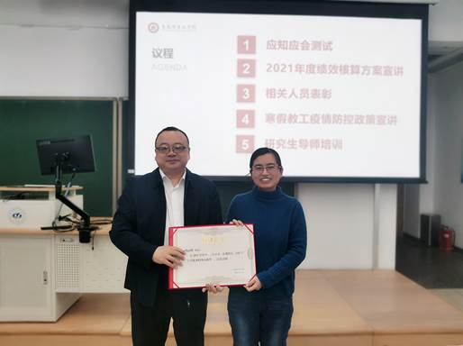 赵义良院长通报了院校两级年度考核优秀人员名单,一一介绍了考核优秀人员的主要事迹,并为学院公共服务贡献奖获得者颁发荣誉证书,号召全体教职工向获被表彰同志学习,学习他们爱岗敬业、任劳任怨、团队协作、无私奉献的精神。