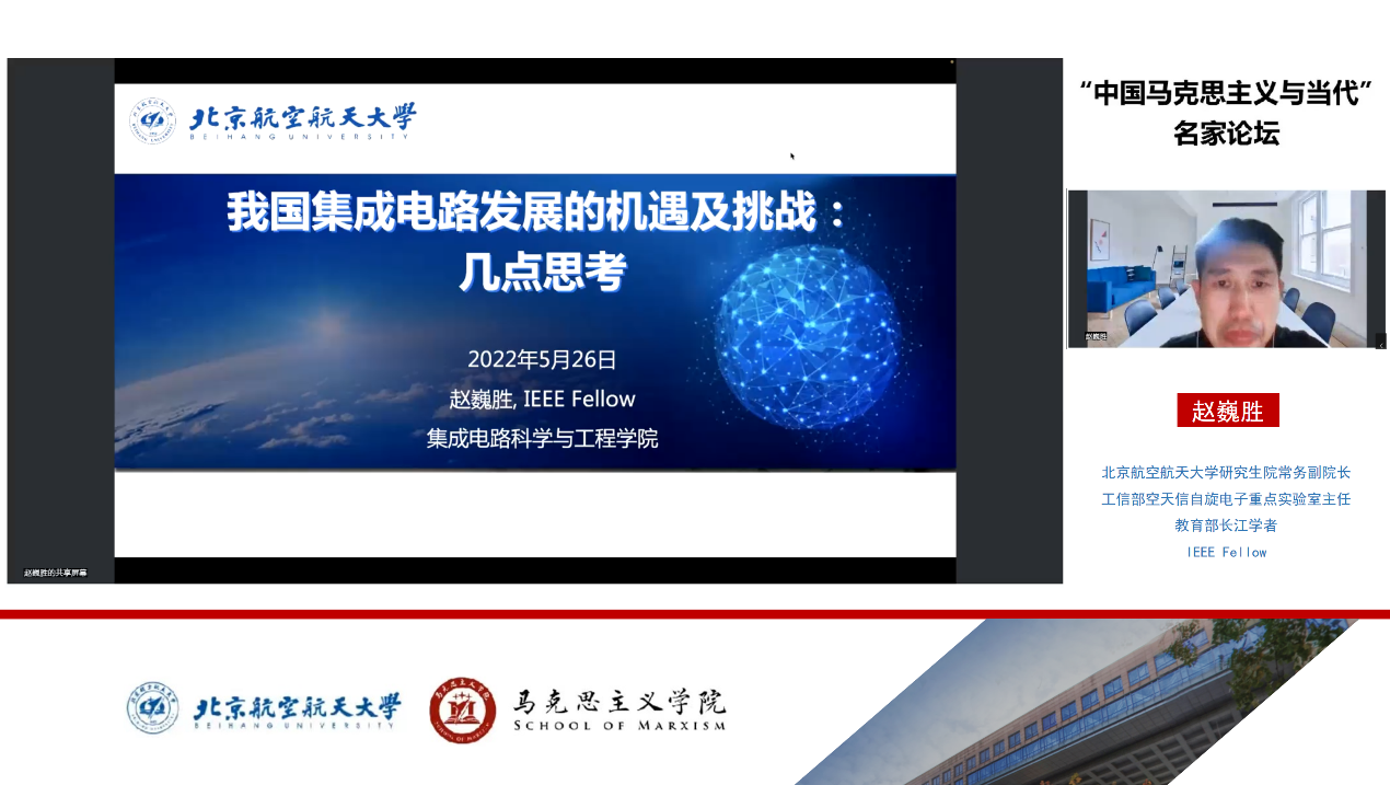 2022年5月26日下午,beat365博士生思政课“中国马克思主义与当代”邀请2021年“科学探索奖”获奖人、beat365研究生院常务副院长、工信部空天信自旋电子重点实验室主任赵巍胜教授做客“名家讲坛”,讲授“我国集成电路发展的机遇及挑战:几点思考”专题报告。beat3652021级博士生在线聆听报告,beat365在线唯一官网部分教师旁听报告。报告由beat365beat365在线唯一官网副院长王娜主持。
