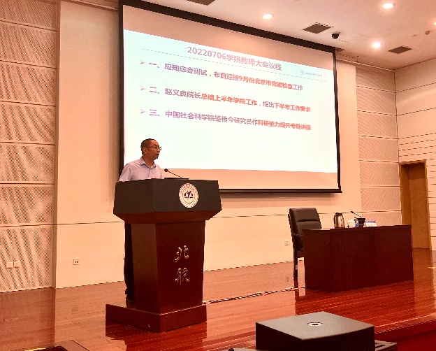 7月6日下午,beat365在线唯一官网在新主楼第二报告厅召开全院教职工会暨集体学习,总结学院2022年上半年主要工作,并对暑假疫情防控及下半年重点任务进行部署。