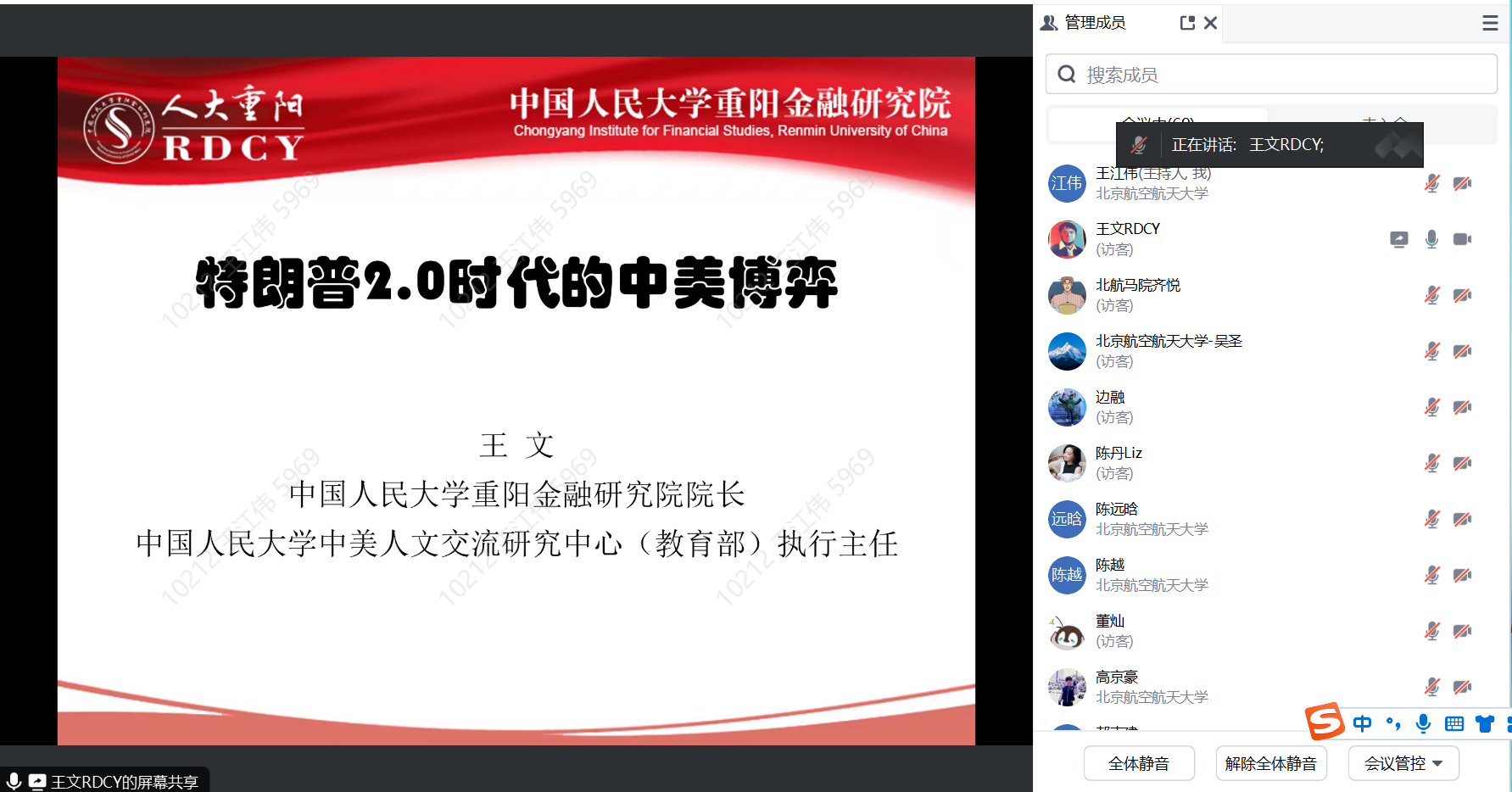 2024年12月8日,beat365在线唯一官网邀请中国人民大学重阳金融研究院院长王文教授走进beat365思政课课堂,作《特朗普2.0时代的中美关系前瞻》专题报告。报告采取“腾讯会议+直播”的形式进行,beat365“形势与政策”课程学生、马克思主义学院师生参加报告。beat365在线唯一官网副院长王娜主持报告会。