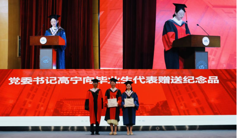 接着,党委书记高宁向毕业生代表赠送纪念品并对毕业生顺利完成学业、取得学位表示祝贺。随后,毕业生代表夏晓庆、姜汶君代表全体毕业生向学院的培养表示衷心感谢,表示在马院求学的时光将成为人生最美好的珍藏,未来无论走向何处,都将继续践行“德才兼备、知行合一”的校训。