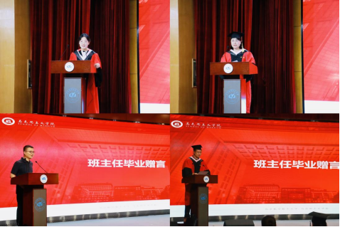 导师代表李雪姣、赵华珺分别代表学院全体教师作毕业赠言。临别之际,李雪姣希望同学们永远做思想清醒的“大人”、做真诚热忱的“小学生”、做“大小”辩证统一的真实人,把自己脚印扎实地踩在大地上;赵华珺则叮嘱同学们始终葆有进取之心和赤诚之心,做能够听见机器轰鸣下人性脉搏跳动之音的思考者。博士毕业班班主任张正清和硕士毕业班班主任王博伟分别代表学院学生工作团队寄语全体毕业生。勉励同学们要保持常交流、肯钻研、勤思考的优良传统,在新时代中国特色社会主义事业的主战场,坚守初心、保持恒心、怀有公心。
