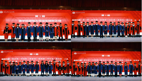 首先,副院长王娜宣读毕业生名单。学院领导和研究生导师代表为全体毕业生一一拨苏正冠,并合影留念。